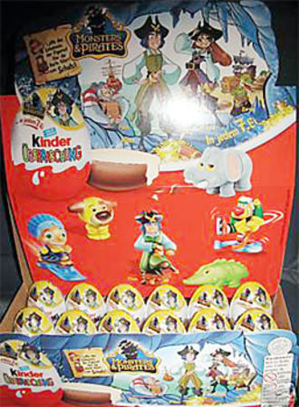 Für die Testverpackung der Monster & Piraten Eier gibt es ein extra Display. Das Bild links zeigt das 72er Thekendisplay der Monster & Piraten. Auf dem Display ist das Ü-Ei mit der Testverpackung zu sehen.