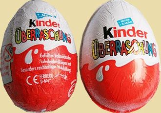Das linke Ü-Ei zeigt die übliche Verpackung des Ü-Eies. Das rechte wurde bei Rewe gekauft und zeigt eine andere Verpackung. Der Schriftzug "Kinder ÜBERRASCHUNG" ist größer und glänzender. Die Verpackung scheint nicht wie üblich eingewickelt zu sein, sondern auf zwei Hälften wie die Ü-Ei Schokolade zusammengedrückt. Die Folie ist so besser gespannt und es ergibt die Falzkante in der Mitte der Umverpackung. Vielleicht handelt es sich hierbei nur um eine Testverpackung.
