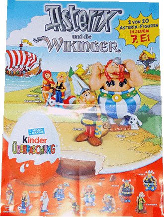Aus Frankreich kommt dieses Diorama der Magic Lessons. Es beinhaltet 4 Figuren und 4 Spielzeuge der Serie. Quelle: [Diese eBay Auktion] Der Asterix Helm ist in einer Werbeaktion von Kinder & Nutella in Spanien auf den Markt gekommen. Quelle: [Diese eBay Auktion] Dieses Diorama aus Frankreich beinhaltet gleich vier Serien. Gezeigt werden Ü-Ei Inhalte von 2006 und 2007. Das Bild rechts zeigt einen Eiermann Rucksack, der noch im Karton ist. Der Rucksack ist aus einem Fliesstoff. Größe des Eiermannes ca. 33 cm x 22 cm x 10cm! [Zu bekommen in dieser Auktion]