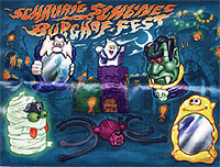 Trotz genereller Auslieferungsverschiebung werden jetzt nach und nach die Halloween 2003 Ü-Eier kommen. Zu erkennen sind die Ü-Eier an den Halloween Hütchen. Auf dem BPZ rechts und links sind unterschiedliche Halloween Inhalte zu erkennen. Das Motto lautet "Schaurig Schönes Burghof-Fest" Parallel dazu kommen die Halloween Kurbisse (Kinder Freude). Die Kurbisse beinhalten z. B. die Kicherhexe Trudi Blotz als Plüsch Figur. Rechts zu sehen ist der Palettenanhänger zu den Happy Halloween 2003. [Live Suche auf eBay. de nach den neuen Halloween Inhalten starten]