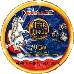Die diesjährige Sonderpackung zu Herr der Ringe III "Die Rückkehr des Königs" kommt in Form einer Ringpackung. Die Sonderverpackung enthält 7 Ü-Ei Figuren mit zwei exklusiven Figuren. Die beiden Figuren werden Gandalf und Schattenfell sein, wie das Cover verrät. Weiterhin beinhaltet die Sonderverpackung ein zauberhaftes Puzzle im Deckel. Drei Puzzlestücke sind rechts auf der Verpackung zu sehen. Das ganze Puzzle ist rechts abgebildet. Innenansicht des Deckels Maßstab 1:2 Der Auslieferungsstart der Sonderverpackung wird vorrausichtlich zwei Wochen nach dem Serienstart sein. Der Stückpreis für die Sonderverpackung pendelt sich schätzungsweise bei 4 bis 6 Euro ein! Die erste Sonderverpackung und alle bis jetzt erschienenen Herr der Ringe Figuren gibt es in unserem Shop [Zum Ü-Ei Shop auf Eierlei. de]