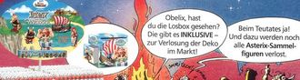 In gewissen Supermarkt Filialen wird es wieder eine Verlosung des Asterix Satzes geben. Der Bildausschnitt zeigt ganz links 4 große Ü-Ei Paletten, wo eine Werbetafel von Asterix befestigt ist und ein Satz Asterix Figuren. Dieser Satz steht zur Verlosung. Neben dem Satz ist die Losbox mit Teilnahmekarten zu sehen. Danke für die News an Frank T.