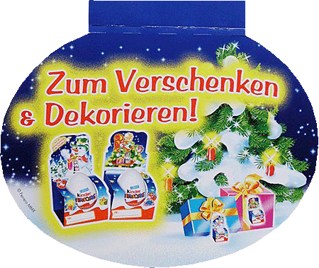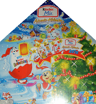 Der Kinder Mix Kalender 2010 ist mit unterschiedlichen Ferrero Leckereien bestückt. Er beinhaltet 4 Ü-Eier, 4 kleine Weihnachtmänner aus Ü-Ei Schokolade, 4 Happy Hippos, 6 Kinder Riegel und 6 mal 2 Schokobons. In den Ü-Eiern sind anscheinend keine Figuren der "Kling-Glöckchenbande". Jedenfalls gibt die Verpackung nichts davon preis. Apropos Preis, der Kalender kostet um die 17 Euro. Hier noch der Palettenanhänger vom Adventskalender. Er ist voll mit Ü-Eiern bestückt. Inhalt: "Die Kling-Glöckchenbande". Der Palettenanhänger zeigt unten einen Schlitten. Dieser Wackelschlitten kann aus der Pappe des Kalenders gebastelt werden. Danke für die News an Christian H.