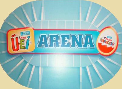 Im geschlossenem Zustand sieht das Diorama aus wie die Allianz Arena bei nächtlicher blauer Beleuchtung. Links ist sogar das neue "Ü-Ei" Logo zu sehen, so wie es auf der neuen Verpackung der Ü-Eier ist. Im Stadion Diorama haben alle 5 Mannschaften Platz gefunden. Auf dem Spielfeld tragen gerade zwei Mannschaften ein Spiel aus. Quelle: [Diese eBay Auktion]