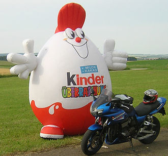 Wir hatten über den Rieseneiermann aus Italien berichtet, daraufhin wurde uns dieses Bild zugesendet. Um das Größenverhältnis von 3 Meter Höhe und 2 Metern Breite besser einschätzen zu können, steht das Motorrad im Fordergrund. Uns ist so ein Reiseneiermann schon mal vor der Ü-Ei Ausstellung in Frankfurt begegnet und in dem ein oder anderen großen Supermarkt als Blickfang. Letztlich eine gigantische Werbeattraktion. Danke für das Bild an Wolfgang K.