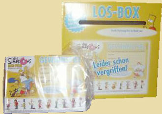 Auf eBay hat sich eine Menge an Simpsons Artikeln angesammelt. Das Bild zeigt die LOS-BOX zum Gewinnspiel. Vorne links sind die Teilnahmekarten noch original in einer Tüte. Quelle: [Diese eBay Auktion] Dieser Simpsons Schirm von Ferrero zeigt leider nicht die Figuren aus dem Ü-Ei, sondern typische Szenen aus dem Film. Den Schirm gab oder gibt es in Portugal. Quelle: [Diese eBay Auktion] Dies ist eine von den beiden Gewinnspiel Röhren der Simpsons. Wie es ausschaut, handelt es sich um keine Varianten, sondern um normale Serienfiguren. Quelle: [Diese Ebay Auktion] Das Bild zeigt eine 48er Packung mit Simpsons Eier. Außergewöhnlich ist hier nicht, dass in jedem Ei eine Simsons Figur steckt, da es keine Ferrero Ü-Eier sind ;-) Quelle: [Diese eBay Auktion] [Alle Ferrero Simpsons Figuren gibt es in dieser Eierlei Shop Rubrik]