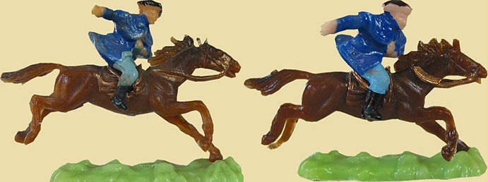 Diese alte Figur "Reiter auf Pferd" oder auch "Paul Revere" genannt gibt es in zwei unterschiedlichen Ausführungen. Die linke Figur ist deutlich kleiner als die rechte Figur. Genau genommen ist das linke Pferd im ganzen zierlicher als das rechte. Diese Entdeckung wurde auf der letzten Börse in Dreieich gemacht und wird im SU Katalog mit aufgenommen. Die schnellste Erkennungsmöglichkeit ist der dünne Arm. Es scheint so, dass die kleine Figur etwas seltener ist. Beim Erwerb der Figur immer darauf achten, dass der Arm heile ist da Fälle bekannt sind, wo der Arm angebrochen ist oder sogar abgebrochen und wieder angeklebt wurde.
