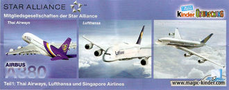 Dem aktuellen Lufthansa Magazin konnten wir interessante Infomationen zu den Modellen der Star Alliance entnehmen. Von Planung bis zur Auslieferung der Modelle vergehen fast 3 Jahre. Insgesamt wurden zwei Millionen Mini Flieger pro Model produziert. Der Start war am 1. März. Es gibt die Modelle nur in 4er Packs, in so genannter "Aktionspackung", die wiederum nur an ausgewählte Händler in Deutschland von Fererro ausgeliefert wurden. Im August 2010 sollten die Mini Modelle auch in den Serien Ü-Eiern stecken. Das Bild zeigt den BPZ der Star Alliance. Eine Frage bleibt aber noch unbeantwortet, auf dem BPZ steht unten links "Teil 1: Thai Airways. . . . " Wird es einen zweiten Teil geben? [Live Suche auf eBay nach A 380 starten]