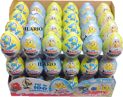 Dieses 72er Thekendisplay gibt es in Italien. In der österlichen Verpackung stecken die GLI ABBRACCIOSI, also die anhängliche Osterbande. Hier ist sogar in jedem 3. Ü-Ei eine Figur. Weiter geht es mit der anhänglichen Osterbande in Spanien. Hier gibt es die Figuren in diesem 6er Pack. [Den Satz und vieles mehr im Eierlei. Shop. de]