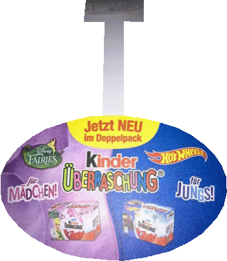 Von den Disney Fairies und HotWheels gibt es 2er Packs. Dies ist der Regalanhänge,r der die beiden 2er Packs bewirbt. Links "Für Mädchen" die Disney Fairies und rechts im blauen Bereich "Für Jungs" die HotWheels. Dahei handelt es sich um sogenannte Testware. Quelle: [Diese eBay Auktion] Danke an Sarah für die News