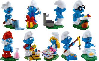 Das Bild zeigt alle 9 Schlümpfe, die zum Ende des Jahres in den Überraschungseiern erscheinen. Es wird auch wieder ein Gewinnspiel geben, wo das ganze Set zu gewinnen ist.