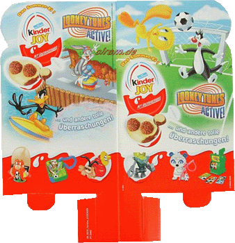 Die Kinder Joy Türme werden mit diesem Kantenschoner geschützt. Bei dem zerbrechlichen Ü-Ei macht dieser Kantenschutz Sinn, aber beim Sommer-Ei tritt die zweite Funktion in den Vordergrund: "Werbung". Der Richtpreis für das Sommerei ist 79 Cent. Jetzt, wo der erste Kaufansturm vorbei ist, werden die Sonderangebote häufiger, z. B. ist in der kommenden Woche das Sommer-Ei bei Kaufland im Angebot für 55 Cent. Im Eierlei Shop haben sich die Preise der Bugs Bunnys relativiert und es wird jede Figur der Serie angeboten. [Shop] [Bugs Bunny] [Wühlkiste] [Sonderangebote]. Des weiteren sind selten alte Ü-Ei Figuren hinzugekommen.