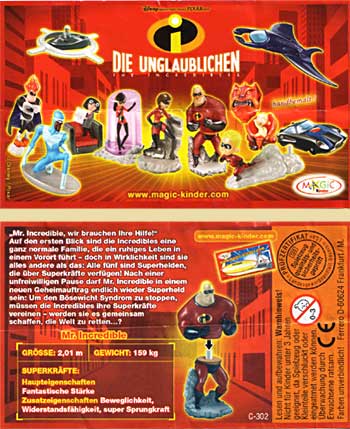 Mit diesem Bericht möchten wir Euch die Figuren der kommenden Serie "Die Unglaublichen" vorstellen. Als erstes die Hauptperson Mr. Incredible. Er besteht aus zwei Teilen und macht einen recht wuchtigen Eindruck. Mrs. Incredible besteht zwar aus einem Stück, wird aber auf einen Tritt gesteckt. Violetta besteht aus drei Teilen. Sie selbst ist wie im Film von ihrem Schutzschild umgeben, so dass die zierliche Figur nicht kaputt gehen kann. Syndrom ist eine Steckfigur, wo der Umhang noch zusätzlich angesteckt wird. Frozone der super coole besteht aus einem Stück. Flash ist eine funktionsfähige Figur, wenn der weiße Stift am Ende der Figur gedruckt wird, flitzt die Figur durch einen Federantrieb nach vorne. Edna ist eine einteilige Figur. Kein Wunder, laut BPZ ist sie auch nur ein laufender Meter. Jack Jack das Baby der Superhelden ist von einem gruseligen Wesen umgeben, wo das obere Teil abnehmbar ist. Die Fahrzeuge der Serie bestehen aus sehr vielen Teilen. Die Bauanleitung der Fahrzeuge ist auf der Rückseite der BPZ abgebildet. Der Auslieferungsstart der Unglaublichen ist der 3. Januar. Trotz Vorurteile gefallen uns im Nachhinein die Figuren ganz gut und wir denken auf Grund des Films werden auch viele nicht Ü-Ei Sammler die Unglaublichen sammeln. Wer diese Bilder einem Freund zeigen möchte, kann am Besten die [News empfehlen] oder die [Druckversion] verwenden!