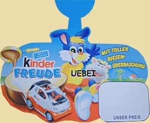 Dieser PAH wirb für die Maxi Eier oder Kinder Freude genant. Neben den Osterhasen ist der gelungene Ferrero smart abgebildet. Des weiteren werden "Tolle Riesenüberraschungen" versprochen.