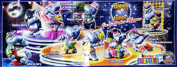 Auch in Frankreich wird es die Happy Hippo Talent Show geben. Die Namen der Figuren sind: John le Jury, Jimmy Jazzy, Roméo le Romantique, Amandine la Ballerine, MC Happy Hippo, Diana Disco, Charly Rock, Eddy Blues und Brian B. le Breakdanseur. Auf der Rückseite wird, wie bei den deuschen BPZ, die Figur vorgestellt. Danke an ruddy für die News Aus Bulgarien kommt dieser Ü-Eier Verkaufstand. Zwei große Ü-Ei Aufsteller sind umgeben mit Ü-Eier Werbung. In den Ü-Eiern sind neben dem Spielzeug die Talent Show Hippos zu finden. Rechts in der Säule steht eine Plüschfigur von MC Happy Hippo. Das Ganze ist so ein Hingucker, dass die Fleischtheke im Hintergrund kaum auffällt ;-)