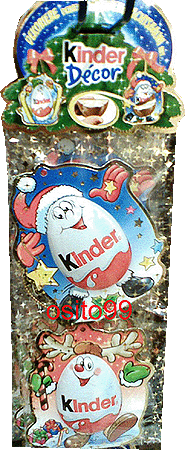 Bei diesem "Kinder Decor" soll es sich um deutsche Testware handeln. Es sind zwei Kinder Schokoeier zum Aufhängen. Die Schokeierhälften sind aus Ü-Ei Schokolade, die auf Décorpappe sind und aufhängt werden können. Es gibt zwei Motive, einmal das Ü-Ei als Weihnachtsmann und einmal als Rentier. Zu bekommen in dieser eBay Auktion Rechts auf dem Bild sind zwei Weihnachtssäckchen zu sehen. In den Weihnachtssäckchen befinden sich die Kindermix Leckerein von Ferrero. Bei den Weihnachtssäckchen handelt es sich ebenfalls um deutsche Testware. Auf dem kleinen Zettel sind die Inhalte zu sehen.