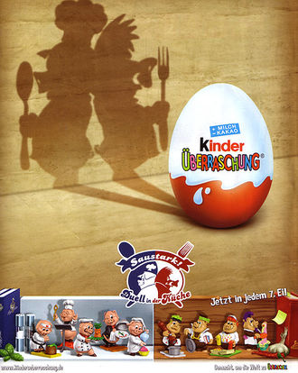 Diese DIN A 4 Seite ist aus der TV TODAY Zeitschrift. Die Werbung zeigt im Schatten des Ü-Ei´s zwei Küchenschweine, die sich duellieren wollen. Unten auf der Seite sind beide Teams vom ""Duell in der Küche" zu sehen. Rechts unten steht noch "Gemacht, um die Welt zu überraschen". Alle Figuren der Serie sind im Eierlei Shop zu bekommen und das noch mit 10% Rabatt. Desweiteren sind Gestern neue Ü-Ei Figuren im Ü-Ei online Shop auf Eierlei hinzugekommen. [Zu den Küchenschweinen]
