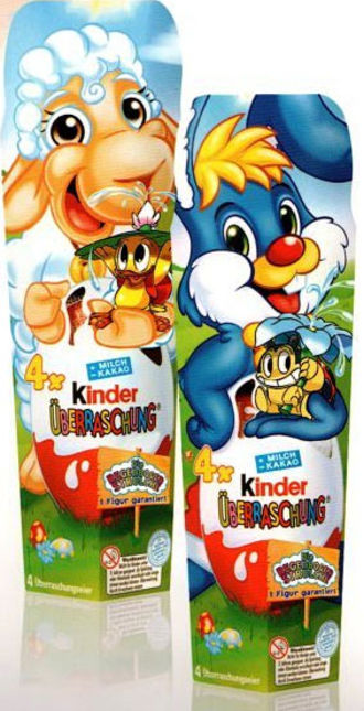 Zu Ostern 2011 wird es "Die Regenbogen-Strolche" geben. Den Beweis liefert dieses Bildmaterial aus einer Ferrero Mappe. Links sind zwei 4er Packs der Regenbogen-Strolche zu sehen. Der Satz besteht aus 8 Figuren. Die Einzeleier gibt es in diesen 3 Umverpackungen. Das 6er Pack garantiert 2 Figuren der Serie. Die Figuren sind niedliche Wasserspritzfiguren. Noch eine Bild der Figuren gibt es im [Sorpresario].