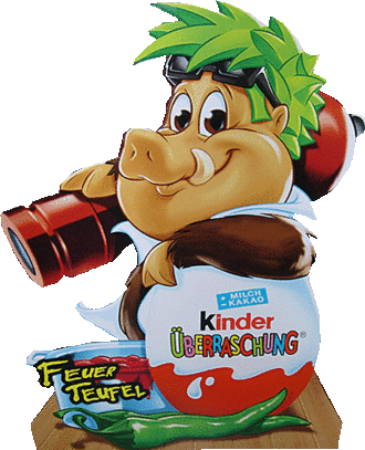 Auf dem Bild sehen wir einen entspannten Willi Chilli, der sich auf ein Ü-Ei lehnt. Die riesen Pfeffermühle und die zwei Peperonis lassen schon drauf schließen, dass hier ein kleiner Feuerteufel am Werk ist. Bei dem Bild handelt es sich um einen Pappaufsteller, der über einen Meter hoch ist. Es gibt den Aufsteller noch von anderen Figuren der Serie.