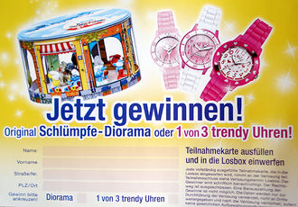 Dies ist die Gewinnspielkarte zu den beiden neuen Serien. Die Teilnahmekarte befindet sich an den großen Aufstellern im Supermarkt. Die Karte muss nur mit der Adresse des Teilnehmers versehen werden und dann ankreuzen, welcher eventuelle Gewinn in Frage kommt. Die Karte kann dann gleich am Aufsteller in die Losbox eingeworfen werden. Danke an Bernd für die News [Seine eBay Auktionen].