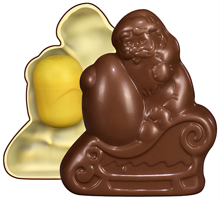 Das Bild zeigt uns einen Weihnachtsmann mit Schlitten. Dabei handelt es sich um ein Hohlfigur aus 75g Überraschungsei Schokolade. Die Besonderheit für uns ist das Ü-Ei in der Figur. Das Bild gewährt einen Blick in die Figur auf die Ü-Ei Kapsel.