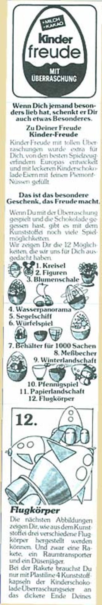 Uns wurden diese zwei BPZ von einem Kinder-Freude (Maxi Ei) Gewinnspiel von 1979 zugesendet. Da die Berichte über alte, schon vergessene, oder nicht bekannte Ü-Ei Sachen sehr gut bei unseren Lesern ankamen, möchten wir weiterhin darüber berichten. Die vier Bilder zeigen zwei BPZ von beiden Seiten. Der lange BPZ links und rechts hat eine Gesamtlänge von 27,5 cm. Auf dem langen BPZ stehen 12 Basteltipps, was alles aus den leeren Maxi Ei Kapseln gebaut werden kann. Insgesamt sind 12 Vorschläge, teilweise mit Bildern, auf den BPZ. Der Favorit ist Nummer 12 der Flugkörper. Auf der Rückseite des BPZ (rechts zu sehen) gibt es Vorschläge zum Ausschneiden, um den Flugkörper zu basteln. Der zweite BPZ ist ein deutliches Stück kleiner. Mit dem zweiten BPZ konnte an einem Gewinnspiel bei Ferrero teilgenommen werden. Dies ist der ganze Text von der Vorderseite des BPZ: "Wenn Du eine neue Idee für die Weiterverwendung des Kunststoff-Eies zeichnest, und sie mit diesem ausgefüllten Zettel an uns sendest, bekommst Du von uns ein schöne Überraschung und nimmst damit außerdem an einem Wettbewerb teil. Eine Jury wird am 15. Januar 80 die besten 6 Vorschläge auswählen. Der Preis für die besten Ideen ist je ein Fahrrad mit allen Drum und Dran, oder der entsprechende Wert in Höhe von 200 Mark. " Die Rückseite des BPZ ist der Teilnahmeschein, wo neben der Anschrift noch eine Bewertung über "Kinder-Freude" abgegeben werden konnte. Vielleicht weiß ja noch jemand, was die schöne Überraschung früher war die man bekommen hat, wenn man an dem Gewinnspiel teilgenommen hatte. Wir hoffen, dass Euch der Bericht gefallen hat und möchten uns bei Hans-Dieter G. für die Bilder bedanken.