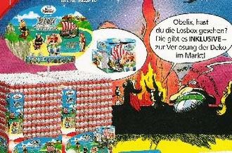 Bei diesem Teilausschnitt eines Werbeblattes ist in der Sprechblase zu lesen: "Obelix, hast du die Losbox gesehen? Die gibt es INKLUSIVE zur Verlosung der Deko im Markt!" Damit gibt es wieder einen Figurensatz in den großen Filialen zu gewinnen.