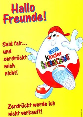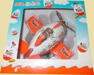 Aus Taiwan kommt dieses eirige Propellerflugzeug. Auf der Verpackung sind Passenderweise Ü-Eier und der Eiermann. [Zu bekommen in dieser eBay Auktion] Das Bild zeigt einen Satz Sticker der Sporty Chicks aus Italien. Den Satz gibt es in den "Mini-Gransorpresa" Eiern. Quelle: [Diese eBay Auktion] Diesen Blechkoffer gibt es in Hong Kong. Im Koffer sind zwei 3er Packs In Ungarn gibt es diese 4er und 6er Packs zu Ostern.