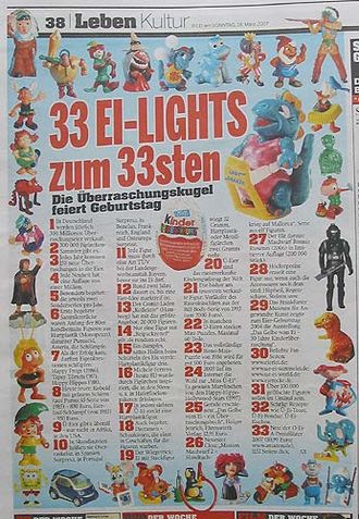 Die Bild am Sonntag hat fast eine ganze Seite über das Ü-Ei berichtet. Der Anlass des Berichtes ist der 33 jährige Geburtstag des Überraschungseies. Es waren genau 33 Figuren rund um den Bericht. Leider wurde nicht deutlich, dass jede Figur zu einem Jahrgang gehört. Inhaltlich war der Bericht ok. Leider dürfen wir den Text nicht zur Verfügung stellen, da es rechtliche Probleme geben könnte. Erfreulich ist, dass unter Punkt 30 "Beliebte Fan-Seiten" www. Eierlei. de an erster Stelle steht. Für die Popularität der Ü-Ei Welt sind solche Berichte förderlich, gerade wenn Werte genannt werden, wie z. B. vom Pumuckl mit Schirm.