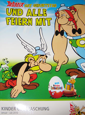 Das Bild ist aus der aktuellen Ferrero Werbemappe. Es zeigt Asterix und Obelix, die sich über ein Ü-Ei beugen. Neben dem geschlossenen Ü-Ei ist eine Asterix Figur zu sehen, die in einer Ü-Ei Hälfte steht. Im Hintergrund läuft noch Idefix durchs Bild :-) Unten auf dem Werbeblatt steht, dass es die Serie vom Januar bis Juli 2010 geben wird. In Frankreich sind Asterix und Obelix Figuren als Maxi Figuren erschienen. Diese beiden Figuren und das tolle 100 Gramm Maxi Ei können wir im Shop anbieten. [Zum umfangreichen Ü-Eier Shop]. Quelle: [Angebot bei eBay]