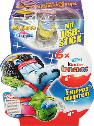 Dies ist das 6er Pack der Happy Hippo Talent Show. Oben in der Discokugel ist der USB Hippo "Toni Turntable". Der integrierte USB Stick beinhaltet Videos und Spiele. Der Stick kann aber auch zum Datenaustausch verwendet werden. Auf den USB Stick passt 1GB. Die Sonderfigur ist somit nicht im Ü-Ei und es gibt auch keinen Beipackzettel dazu. In den 6 Ü-Eiern werden 2 Hippo Figuren garantiert. Danke an Dina. "Angebote bei eBay"