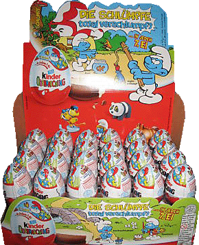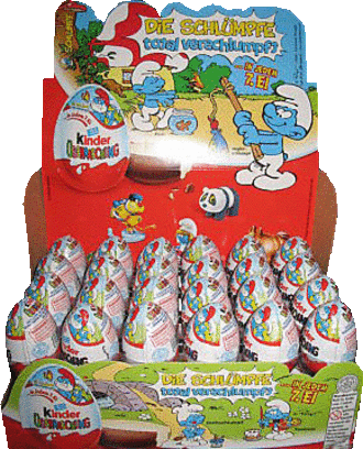 Die Schlumpf Ü-Eier in der Testverpackung gibt es in diesem 72er Display. Auf dem Display ist ebenfalls das Ü-Ei im Schlumpfgewand zu sehen.