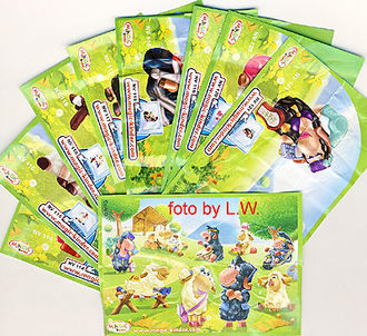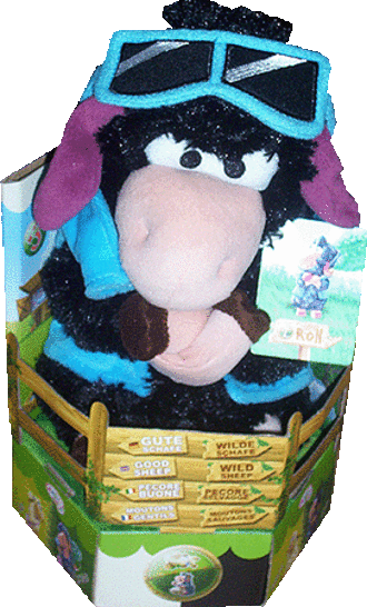 In Deutschland wurden diese Plüsch Schafe ausgeliefert. Das Bild zeigt Ron Rebell. Der Gag an den Figuren ist, dass sie auf links gezogen werden können und man dadurch ein zweites Schaf hat. Wenn Ron Rebell umgekrempelt wird, kommt Timmi Träumer zum Vorschein. Ein kleines Schild an der Figur deutet den Verwandlungszweck an. Diese Figur wurde in einem Globus Markt entdeckt. Auf der Verpackung sind Wegweiser in unterschiedlichen Sprachen zu sehen, so dass davon ausgegangen werden kann, dass die Figuren auch in anderen Ländern erscheinen werden. Mehr Bildmaterial und Informationen zu den Plüsch Schafen gibt es in diesem [Forum Beitrag]. Danke an Dirk für die Ü-Ei Neuigkeit