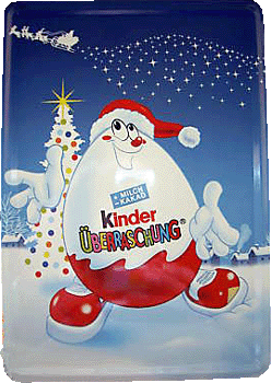 In Polen ist von der Monsters & Pirates Serie dieses 6er Pack erschienen. Im 6er Pack sind zwei 3er Packs enthalten. Die Besonderheit des 6er Packs ist die lange Verpackung. Auf der Innenseite der Verpackung ist ein Spiel zu den Figuren aufgedruckt. In der Schweiz ist dieses 6er Packs erschienen. Das linke 6er Pack ist mit dem Weihnachtsmann versehen. Das rechte Bild zeigt die MADAGASCAR 2 Serie auf der Verpackung. Laut Verpackung werden 2 Figuren der MADAGASCAR Serie garantiert. Danke an Andreas H. für die Bilder Aus Kanada haben wir diese beiden Bilder bekommen. In der linken Kung Fu Panda Verpackung sind zwei Ü-Eier enthalten und drei Kinderriegel. Auf dem rechten Bild ist ein 4er Pack Ü-Eier zu sehen, sowie eine große Weihnachtskugel. Der Tannenbaum ist ein weiteres 4er Pack Ü-Eier und als letztes die Kinder Mix Verpackung, wo der Elch das Tablett mit dem Inhalt auf der "Hand" trägt. Danke an Wolfgang M. für die Bilder und grüße nach Kanada.