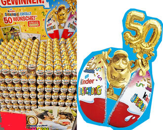 Um gewinnen zu können muss ein goldener Kinderino mit der 50 in Hand aus dem Kinder Überraschungsei gezogen werden. Das Bild zeigt uns nicht nur den goldenen Kinderino, sondern auch die halb goldenen Ü-Eier in den die Figur stecken könnte.