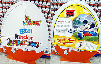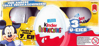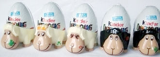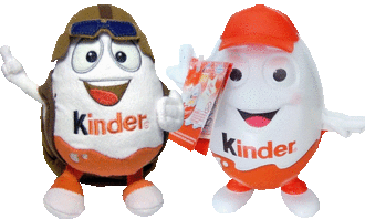 Diese beiden Eiermänner sind ca. 15 cm groß. Der linke Eiermann ist eine Plüschfigur. In seinem Rucksack befindet sich Kinderschokolade. Der rechte Eiermann ist aus Plastik und er beinhaltet 3 Kinder Joy Eier. Herkunftsland ist Afrika. Quelle: [Diese eBay Auktion] und der Eiermann als 3er Pack [Diese eBay Auktion ]
