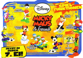 Dieses 3er Pack von Micky Maus und Freunde gibt es im Aldi. Das 3er Pack ist schön bunt in ansprechenden Kinder Farben designt. Durch die den beiden Ausschnitten in der Verpackung können die Ü-Eier gesichtet werden. Die Rückseite ist Tick im sprung mit den sein roten Skatboard zu sehen. Neuerdings gibt es immer einen Hinweis auf die Kinderüberrasschung Seite auf Facebook. Die ersten Sätze haben wir jetzt bei uns im Eierlei Shop. Oder eine Live Suche auf eBay nach Micky und seine Freund starten.