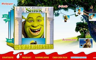 Das Bild zeigt einen Teil des Internet Auftritts von Kinderjoy. de! Auf der Webseite werden alle Figuren in einem gut gemachten Intro vorgestellt. Weiter geht es mit der Erläuterung vom Kinderjoy Ei. Der Trailer zum Film kann eingesehen werden und zum Download gibt es Wallpaper, E-Cards und einen Screensaver. www. Kinderjoy. de Im Eierlei Shop sind ab sofort Shrek Sätze und das Spielzeug zu bekommen. [Zum Eierlei Shop]