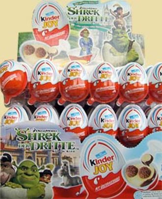 Der angesetzte Auslieferungstermine für Shrek der Dritte ist der 7. Mai!. Die ersten 72er Displays sind schon zu bekommen. Diese Toleranz gab es bei ICE AGE 2 auch, genau so wie viele Filialen noch nicht am 7. Mai die Kinder Joy Eier geben wird. Das linke Bild zeigt einen 72er Display, wo der Umkarton gleichzeitig das Thekendisplay ist. Rechts auf dem Bild ist ein geöffnetes Thekendisplay zu sehen. Im Eierlei Preiskatalog sind gerade die Galerie Bilder der Shrek Figuren eingestellt worden. [Zum Preiskatalog]