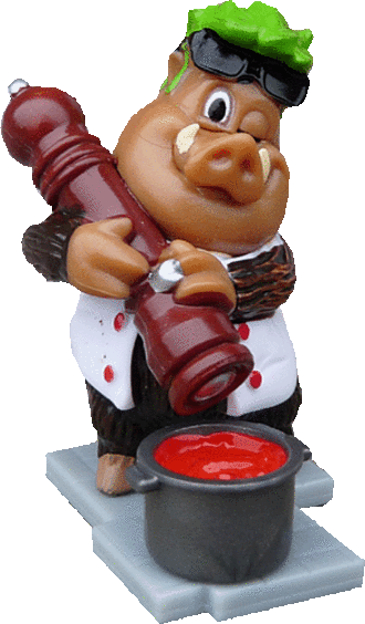 Bevor der Serienstart angelaufen ist gibt es die ersten Figuren und BPZ. Als erstes möchten wir kurz den BPZ vorstellen. Der BPZ sieht aus wie zweigeteilt. Links ist das blaue Team "Pigfein" und rechts ist das Küchenteam "Schweinelecka". Das Team Pigfein besteht aus 5 Schweinchen. Die Namen: Hick Hack, Toni Tatääää, Kalle Konfekt, Didi Deko und Ottmar Oktav. Das Schweinelecka Küchteam besteht aus 4 Wildschweinen. Die Namen: Ronnie Rot-Weiß, Brunold Brutzel, Antonio Aldente und Willi Chili. Fünf Figuren sind mit Zubehör ausgestattet. Die Bemalung sieht sehr detailliert und modern aus. Damit scheint es wirklich ein saustarkes Duell in der Küche zu werden ;-) Die ersten Sätze sind in [dieser eBay Auktion zu bekommen].