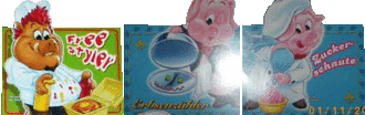 Die drei Bilder zeigen die Palettenanhänger vom Kochduell. Los geht es mit Ronnie Rot-Weiß den Free Styler, dann kommt Toni Tatääää der Erbsenzähler und zu Didi Deko gibt es den Slogan Zuckerschnute. Die PAH sehen anders aus als die in dem Werbefolder (wir berichteten am 29. 10. 2010: Saustark geht es los). Quelle: [Diese eBay Auktion]