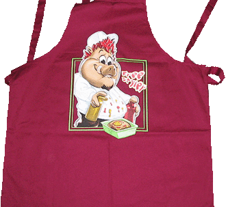 Wieder eine tolle Markenting Idee ist diese Kochschürze. Die Farbe der Schürze entspricht der des roten Teams. Als Motiv ist Ronnie Rot-Weiß zu sehen. Ronnie Rot-Weiß ist gerade dabei einen Hamburger zu dekorieren nach dem Motto "Free Styler". Insgesamt soll es sogar drei unterschiedliche Motive von den Küchenschweinen geben. Wahrscheinlich wird es diese Schürzen nicht im freien Handel geben.
