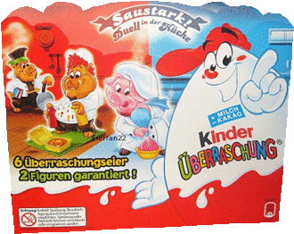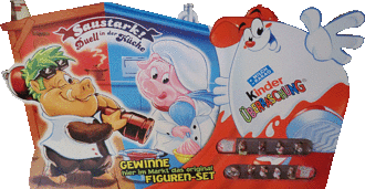 Nicht nur die ersten Ü-Eier vom "Duell in der Küche" sind zu bekommen, sondern auch schon das 6er Pack zur Serie. Saustark geht es weiter, wenn das 6er Pack geöffnet wird. Eine schöne Kulisse mit allen Figuren ist zu sehen. Links ist das Team "Schweinelecka" und rechts das Team "Pigfein". Zwei Figuren werden garantiert, aber dafür ist der Anschaffungspreis von ca. 3,75 Euro nicht ohne. Ab sofort können wir den ersten Posten Sätze von den saustarken Schweinen anbieten. [Zum Ü-Eier online Shop]. Danke für die Bilder an Eierfan22