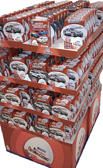 In den aktuellen Ü-Eiern sind die 4 Porsche Modelle sehr selten enthalten, aber jetzt hat die Auslieferung der 4er Packs begonnen, wo 2 Porsche Modelle garantiert werden. Bei der Metro in Bremen ist der Preis pro 4er Pack 2,59 Euro. Auf den 4er Packungen steht "Limitierte Sonderedition".