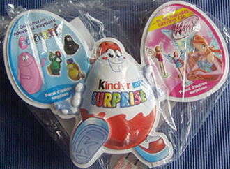 Dieses Werbematerial kommt aus Frankreich. Beworben wird die aktuelle Barbapapa Serie und die WinX. Der Eiermann, der die beiden Ei Hälften hoch hält, ist ca. 30 cm breit und 20 cm hoch. Das Material ist Plastik. Quelle: [Diese eBay Auktion] Das Bild zeigt ein aktuelles einer Pack aus Russland. In den Packungen soll fast immer eine Kung Fu Panda 2 Figur stecken. Quelle: [Diese Facebook Seite] In Polen gibt es diese beiden 6er Packs von den NATOONS und SPRINTY. Live Suche auf eBay nach den NATOONS starten.