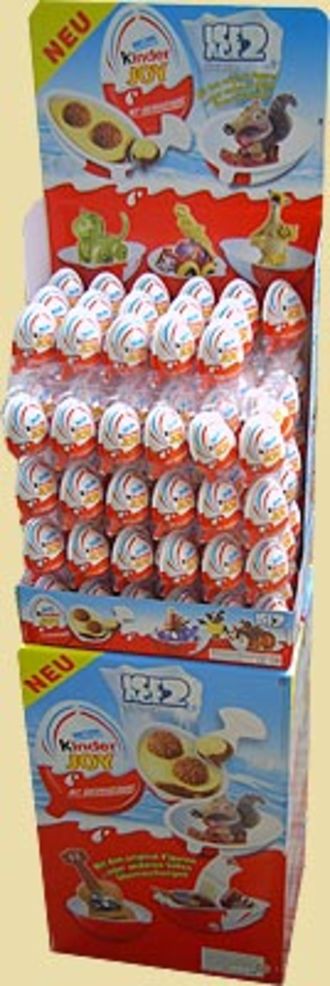 Das Bild zeigt einen uns noch nicht bekannten 144 Aufsteller der Kinder-Joy Eier. Dieser 144 Aufsteller stammt aus einer Schlecker Filiale. Dieser schmale Aufsteller weckt Erinnerungen an die allerersten Ü-Ei Aufsteller von Ferrero. Ferrero hatte damals damit geworben, dass der Aufsteller nur eine Stellfläche von einem A4 Blatt benötigt. Nachzulesen auf der [Setzbaukasten] Seite. Fazit der Kinder-Joy Eier in Deutschland: Die Kinder-Joy Eier sind flächenddeckend ausgeliefert worden. Die Ice Age 2 Inhalte haben wahrscheinlich mit dazu beigetragen, dass es bereits jetzt teilweise keine Kinder-Joy Eier mehr gibt. Bleibt nur zu hoffen, dass es im Sommer 2007 wieder Kinder-Joy mit interessanten Inhalten in Deutschland geben wird. [Alle Ice Age Figuren gibt es im Eierlei Shop] Danke an matlar12 für die News