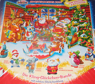 Traditionell gibt es von Ferrero wieder einen Adventskalender. Diesmal ist der Satz "Die-Kling-Glöckchen-Bande" enthalten. Das besondere an der Serie ist nicht, dass die Figuren am Christbaum angehängt werden können ;-), sondern das jede Figur mit einem echten Glöckenklang ausgestattet ist. Der Satz besteht aus 7 Figuren, die auf dem unteren Bild zu sehen sind. Zu bekommen sind die ersten Sätze in [dieser eBay Auktion]