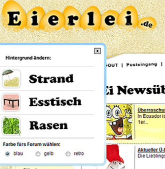Wir haben auf Eierlei auf das Sommerlayout (Strand) gewechselt. Alle angemeldeten Eierlei User können ihr Eierlei Layout frei wählen. Einfach auf den blau umrahmten Sonnenschirm klicken (unterm Eierlei Logo zu finden), danach kommt die Auswahl wie auf dem Bild zu sehen. Als weitere Einstellungen kann die Hintergrundfarbe im Forum ausgewählt werden. So kann sich jeder registrierte Eierlei User sein eigenes Eierlei Layout zusammenbauen. Das Anmelden auf Eierlei ist unverbindlich und einfach (schon 28. 624 Eierlei User sind dabei). [Zur kostenlosen Eierlei Anmeldung]