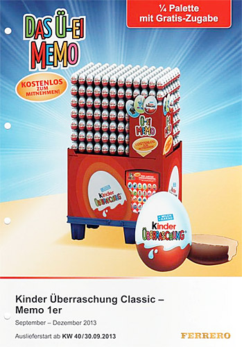 Dieses Werbeblatt zeigt einen 672er Ü-Eier Aufsteller. Das Besondere sind die 100 Ü-Ei Memo Blätter, die an jedem Aufsteller sein werden. Beim lustigen Gedächtnisspiel müssen zwei gleiche Figuren aufgedeckt werden. Auslieferungsstart ist der 30. 09. 2013! Der Kantenschoner weist ebenfalls auf das Ü-Ei MEMO hin. Wollen wir hoffen, dass jeder nur ein Ü-Ei Memo Spiel mitnimmt.