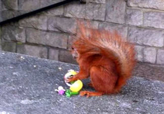 In Hamburg wurde dieses Foto geschossen. Das Eichhörnchen hat gerade die Ü-Ei Kapsel geöffnet. Vielleicht dachte sich das Eichhörnchen es wäre eine Walnuss mit leckerem Inhalt.